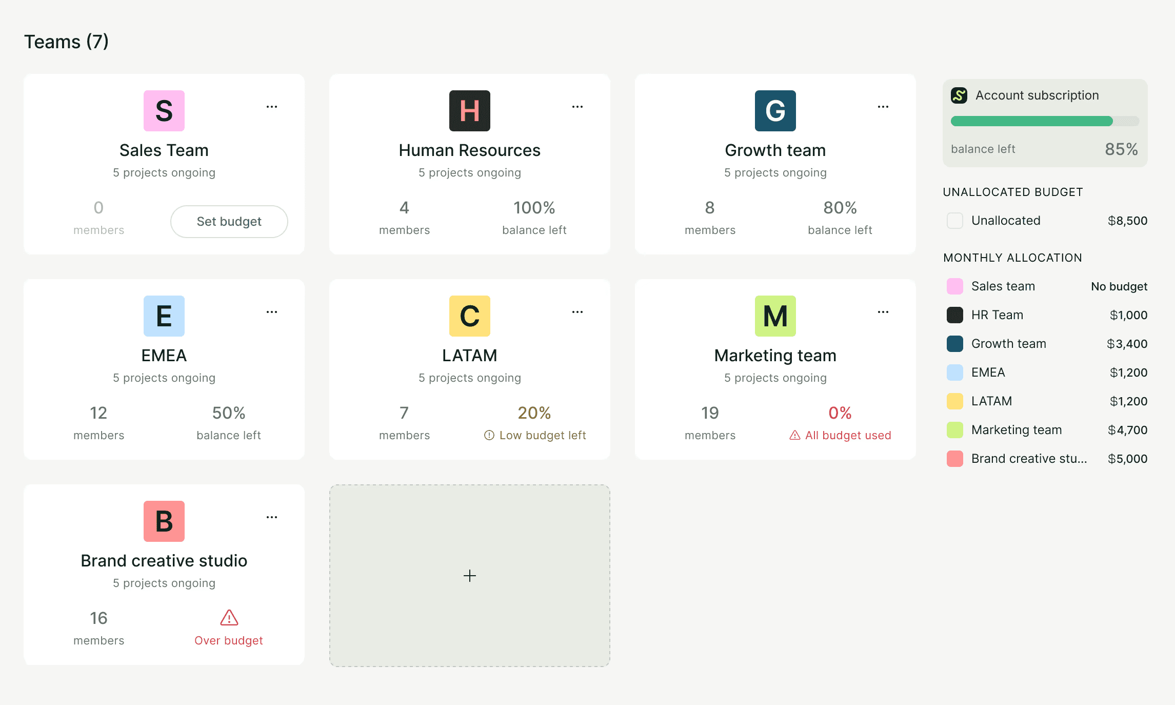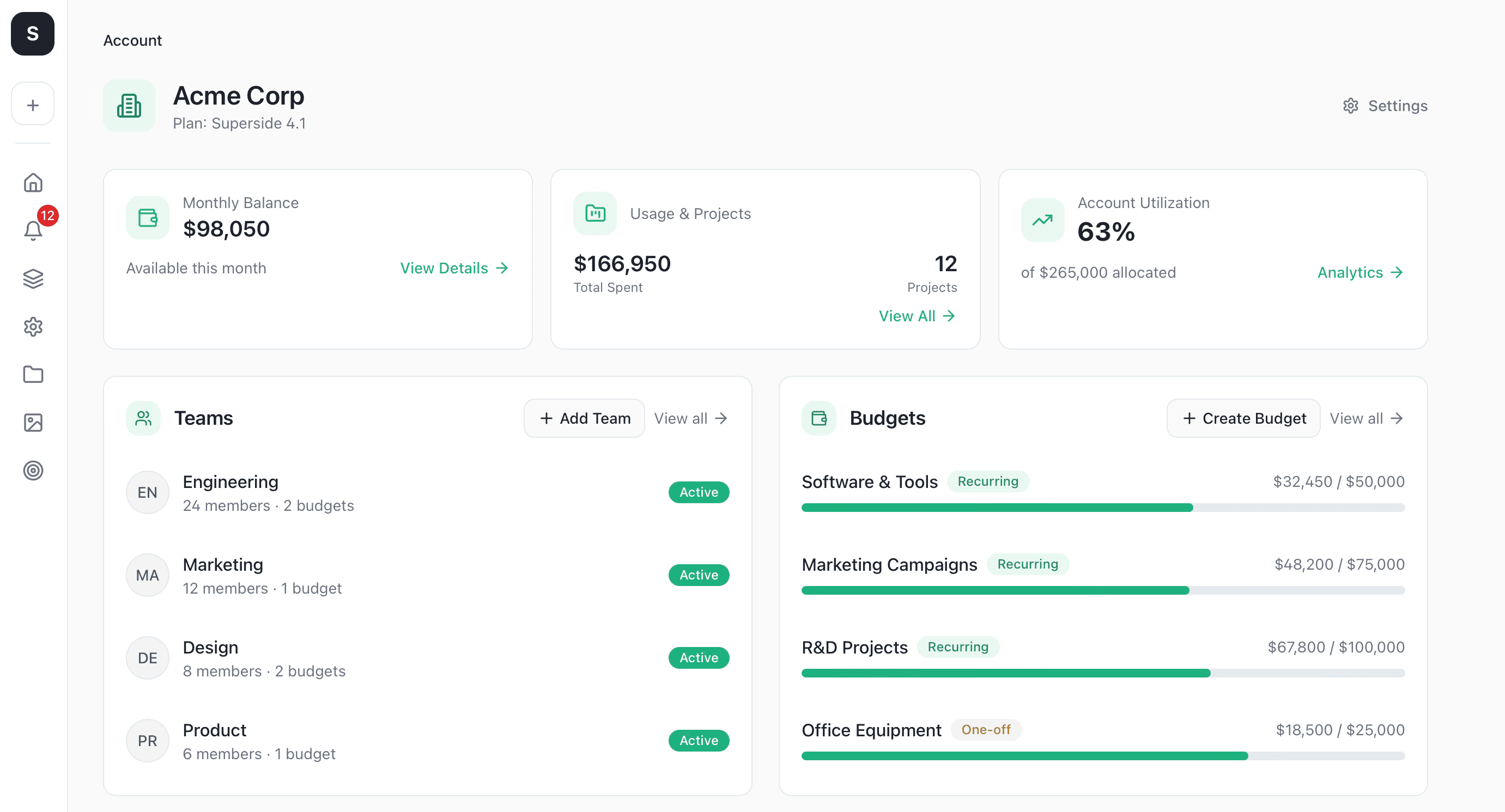 As Superside moved upmarket, enterprise account growth was hitting a structural limit. Larger organisations needed to manage spending across multiple teams — but the platform had no concept of team-level budgets.