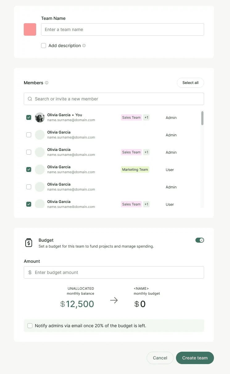 The initial iteration introduced team creation and budget allocation, allowing organisations to assign spending limits to individual teams and test whether team-based budgeting could support enterprise customers and unlock account expansion.